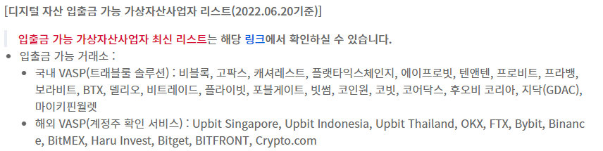 아래는 업비트 공지사항에서 가져온 입출금 가능 거래소(흔히 말하는 트래블룰 관련) 리스트이다.